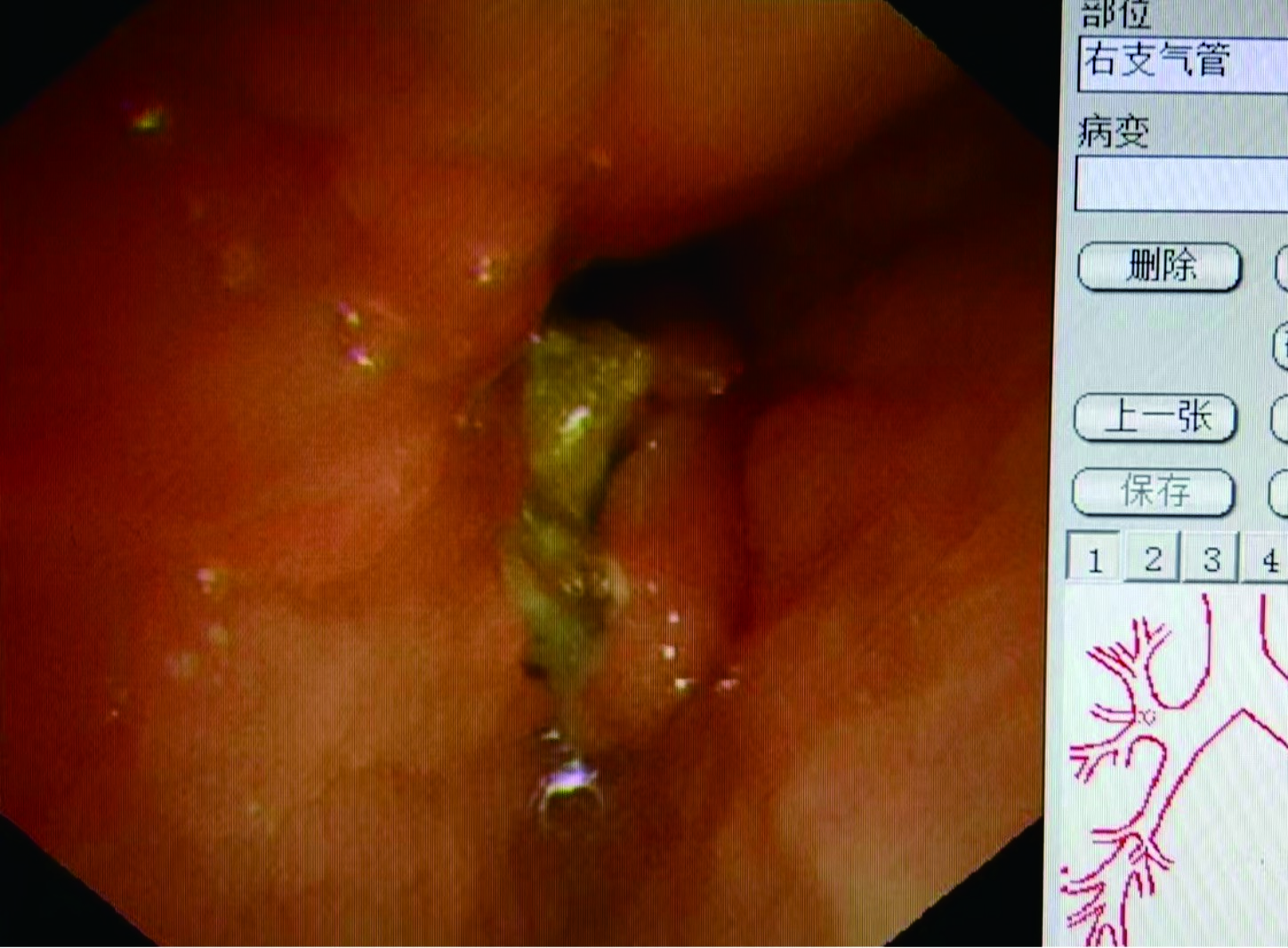 经科室详细安排,患者完成了胸部增强CT及电子支气管镜检查,结果让医生们大吃一惊:右侧主支气管内卡有一异物,异物周围肉芽组织显著增生,几乎将管腔完全堵塞,导致患者通气严重受阻。