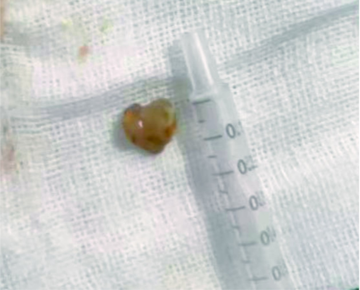 面对这一棘手情况,科室多次组织讨论,最终为易婆婆制定出周全的手术治疗方案。在静脉麻醉下,医疗团队凭借娴熟的技术和丰富的经验,通过电子支气管镜的复杂操作,最终将异物取出,发现是一块“鸡骨头”。随后又对局部肉芽组织进行了多次冷冻治疗,逐步清除增生部分,使右侧主气管恢复通畅。