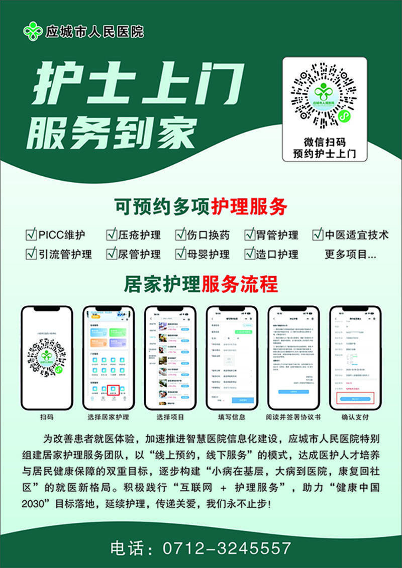 互联网+护理服务是我院积极响应国家“互联网+医疗健康”政策的具体实践,旨在通过信息化手段,通过线上预约和线下服务相结合的模式,让优质医疗护理资源突破空间限制,惠及更多有需要的人群。此次服务涵盖了骨科术后拆线、康复指导等多个方面,患者只需通过手机微信搜索应城市人民医院或扫描二维码点击互联网医院即可轻松预约,享受专业上门服务。