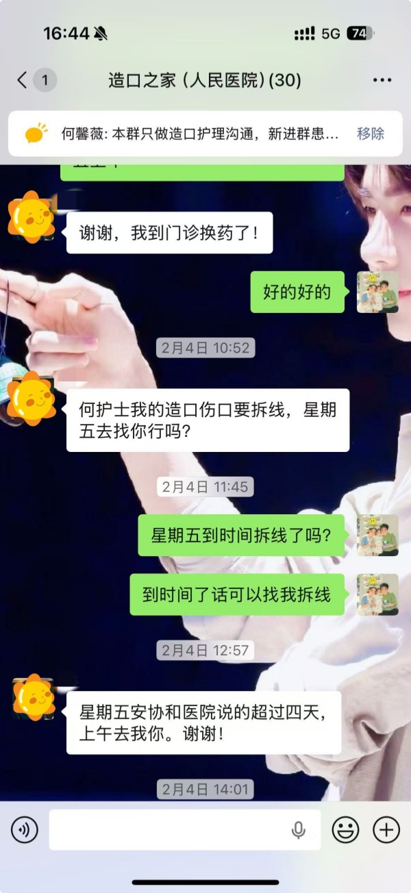 胃肠外科以科主任、护士长为龙头,专科护士为主要成员,建立造口之家微信群,提供24小时在线答疑,让出院后患者不管在哪儿都没有顾虑,戴“罩”生活。