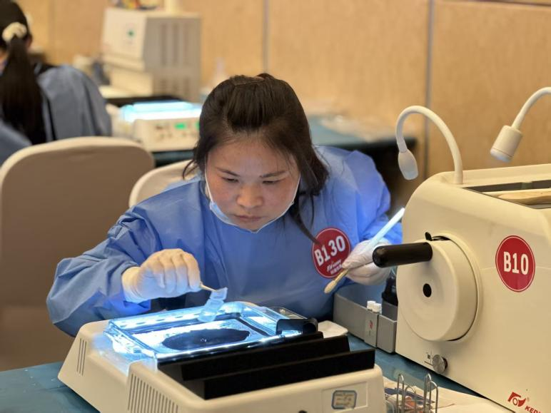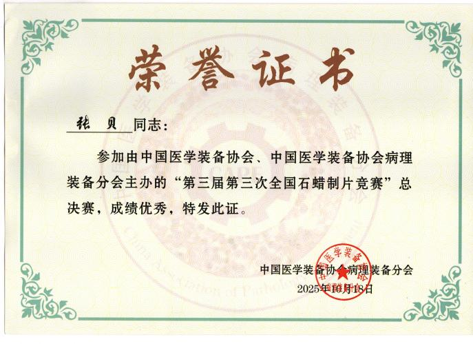 2025年6月7日,在全国石蜡制片竞赛武汉赛区选拔赛中,张贝凭借精湛的石蜡切片技术,在众多参赛选手中崭露头角,荣获湖北省二等奖,顺利晋级全国总决赛。10月16日至19日,张贝远赴湖南长沙参加第三届全国石蜡切片竞赛总决赛。在这场汇聚全国病理技术精英的高水平赛事中,她与各地选手展开激烈角逐,凭借扎实的技术功底和沉着冷静的发挥,最终荣获优秀奖。
